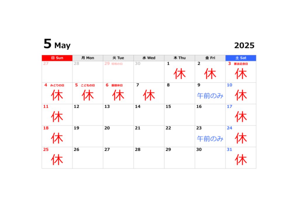 2025年5月営業カレンダー