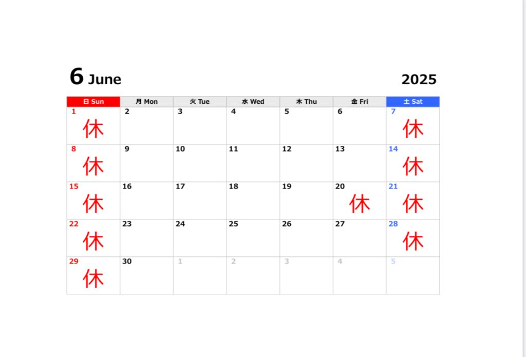 2025年6月営業カレンダー